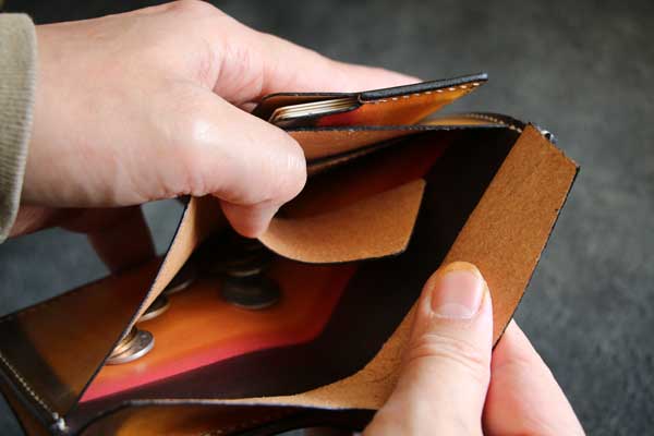 ・収納時、小銭が全体に広がり、お財布がフラット形状に。