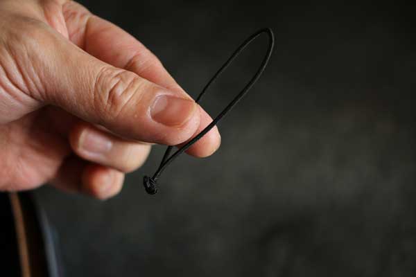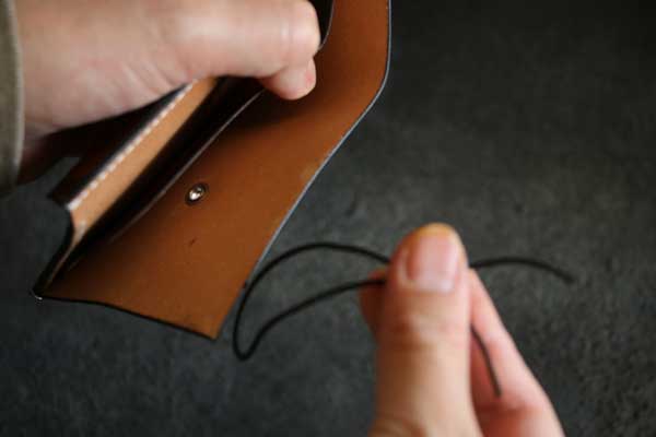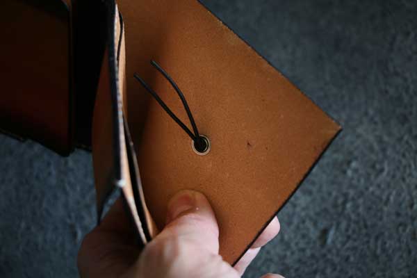 使い始めは革が硬いので、開き防止のためゴムをつけています。